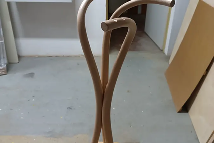 Dětský stojanový věšák z ohýbaného bukového dřeva tvoří tři ramena, zhotovená z dílů z výroby firmy TON, která jsou vsazena do pevné podstavy. Konstrukce je řešena tak, aby se věšák nepřevrátil, a proporčně upravena s ohledem na výšku dětí.