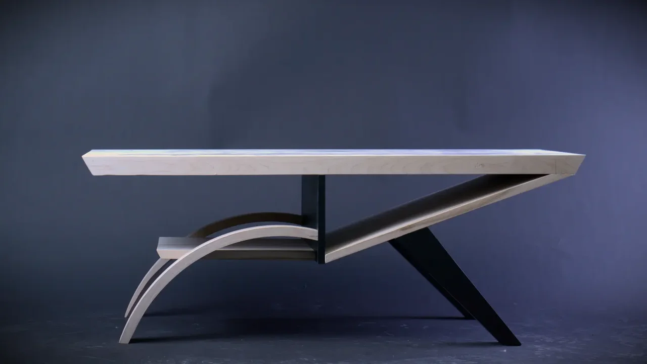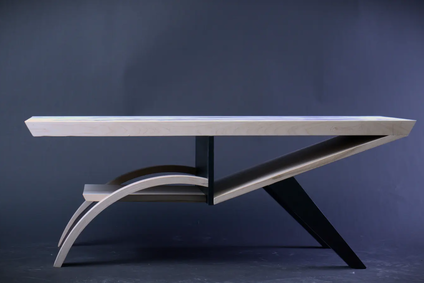 Konferenční stolek kubizujícího tvarosloví je vyroben z javorového masivu v kontrastních barvách černé a bílé. Je praktický díky dvěma odkládacím plochám: zkosená plocha uvnitř stolku slouží jako místo pro odložení časopisů, zatímco protější rovná funguje jako klasická police.